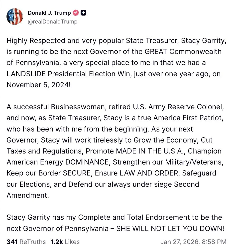 Upon receiving President Trump’s endorsement, Pennsylvania State Treasurer Stacy Garrity said: “I am honored to receive the endorsement of President Donald Trump. In 2016, President Trump did what no Republican presidential nominee in 28 years was able to accomplish – win the Commonwealth of Pennsylvania. And in 2024, he repeated this feat by an even larger margin. Why? Because President Trump has been a voice for hardworking Americans who have been too often left behind, by standing up to our international adversaries like China, lowering the tax burden on families and small businesses, and returning pride to our nation.”